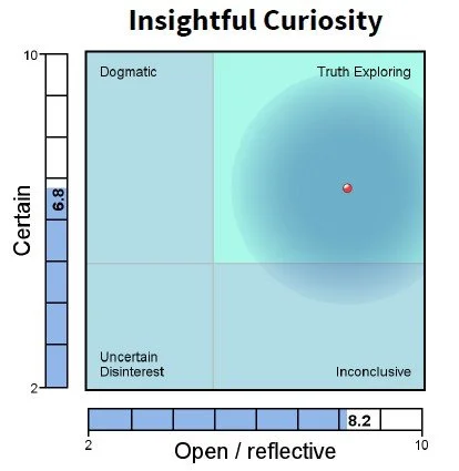 Only one team member, D, has a high certain score. Let’s call him David. So, David, relative to the rest of the team, probably comes across as more certain in his opinions, even though he is quite open/reflective as well. What might happen on this team when they don’t understand this paradox is that David could be perceived as impatient because he might often say something like, “Can we come to a conclusion now?” This is unfortunate because David has a true strength of insightful curiosity or truth exploring.